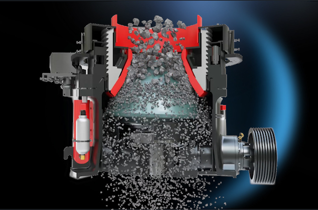 在工作時通過電動機的旋轉帶動帶輪或聯(lián)軸器、傳動軸和圓錐部在軸心線下使偏心軸做周期性旋擺運動。在物料從料口進入破碎腔后因受到偏心軸和軋臼壁的相互沖擊擠壓、研磨、揉搓從而產(chǎn)生破碎的作用。液壓保險系統(tǒng)能在機器發(fā)生過鐵故障或者悶車現(xiàn)象時通過液壓將支撐套和定錐部排除出故障物,在起到很好的保險作用的同時大大的降低了維修率及提高生產(chǎn)效率。