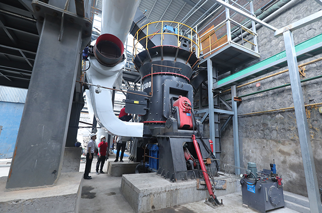 主電機(jī)通過減速機(jī)帶動(dòng)磨盤轉(zhuǎn)動(dòng),固定的磨輥沿磨盤滾道自轉(zhuǎn)。物料從下料口落在磨盤中央,在離心力的作用下,物料從磨盤中央向邊緣勻速移動(dòng),經(jīng)過粉磨滾道時(shí),受到磨輥的碾壓,碾磨力由液壓加載系統(tǒng)提供,大塊物料直接被壓碎,細(xì)粒物料受擠壓后形成料床進(jìn)行粒間粉碎。烘干與粉磨同時(shí)進(jìn)行,一次熱風(fēng)通過風(fēng)環(huán)均勻進(jìn)入磨盤周圍,將經(jīng)過輾磨從磨盤上切向甩出的粉碎物料烘干并輸送到上部選粉機(jī)處,在轉(zhuǎn)子葉片的作用下,粗顆粒重新回到磨盤上粉磨(內(nèi)循環(huán)),合格的細(xì)粉隨氣流一起出磨,被系統(tǒng)集粉器收集,即為成品;少部分難粉碎且一次風(fēng)吹不起的較大顆粒、雜質(zhì)等通過風(fēng)環(huán)跌落至磨機(jī)下部一次風(fēng)室被刮料裝置排出機(jī)外,或經(jīng)輸送設(shè)備由進(jìn)料口進(jìn)入立磨重新粉磨(外循環(huán))。