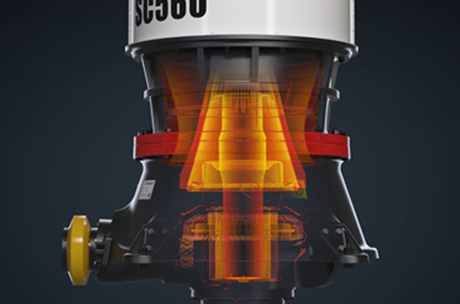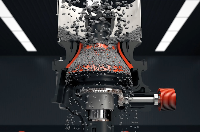 單缸圓錐破碎機(jī)工作時,電機(jī)帶動破碎機(jī)的小齒輪,小齒輪帶動大齒輪,大齒輪組件帶動偏心套組件和主軸組件以理論垂直線為中心,在銅襯套內(nèi)公轉(zhuǎn),主軸組件在偏心銅套內(nèi)以主軸的中心線可以實(shí)現(xiàn)自轉(zhuǎn)。當(dāng)物料加入到破碎腔后,主軸總成在物料的阻力下在偏心銅套內(nèi)緩慢的自轉(zhuǎn)。內(nèi)錐的運(yùn)行軌跡看起來是在破碎腔內(nèi)來回擺動,同時緩慢的旋轉(zhuǎn)。物料被擺動的內(nèi)錐擠壓破碎,破碎出的物料從而排料口排出。